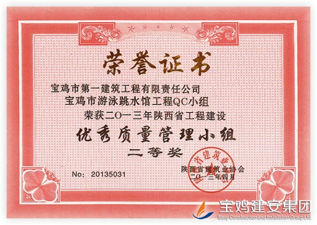 QC Team Award of Baoji Swimming and Diving Hall