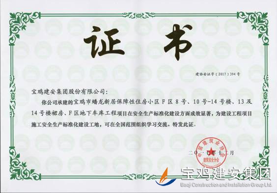 2017年11月23日,從中國(guó)建筑業(yè)協(xié)會(huì)建筑安全分會(huì)獲悉,由我公司八項(xiàng)目部承建的寶雞市蟠龍新居保障性住房小區(qū)F區(qū)8號(hào)、10號(hào)—14號(hào)樓、13及14號(hào)樓裙房、F區(qū)地下車庫(kù)工程在安全生產(chǎn)標(biāo)準(zhǔn)化建設(shè)方面成效顯著,被評(píng)選為建設(shè)工程項(xiàng)目施工安全生產(chǎn)標(biāo)準(zhǔn)化工地,可在全國(guó)范圍內(nèi)組織學(xué)習(xí)交流。這是繼2016年后我公司第二次榮獲此殊榮。我公司連續(xù)兩年獲此榮譽(yù),為進(jìn)一步提高我公司在建筑行業(yè)的影響力,提升企業(yè)形象,促進(jìn)企業(yè)長(zhǎng)遠(yuǎn)發(fā)展奠定了一定的品牌基礎(chǔ)。
