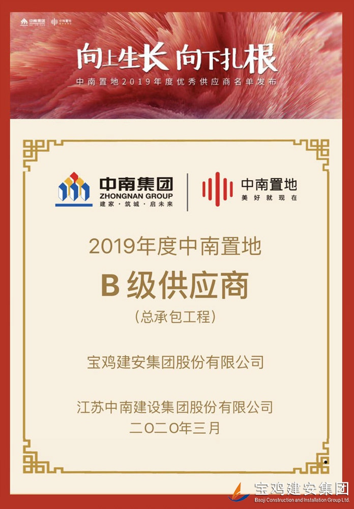 “中南置地2019年度優(yōu)秀供應商”由中南置地設立,從全國100座城市360個標桿項目中選出,A級供應商8家,B級供應商36家。寶雞建安集團股份有限公司在360個標桿項目中脫穎而出,成為陜西省唯一一家B級供應商。