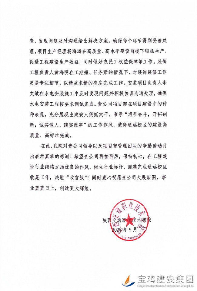 據(jù)悉,陜西交通職業(yè)技術(shù)學(xué)院新校區(qū)一期建設(shè)項(xiàng)目【EPC】一標(biāo)段建筑面積為48200.59平方米,工程造價(jià)3.4億。合同工期為2021年11月25日至2023年7月7日總工期600天,實(shí)際開工日期為2022年5月4日,經(jīng)過一年多的施工,現(xiàn)已完成教學(xué)樓和室外工程全部施工內(nèi)容,并于2023年9月1日正式投入使用。