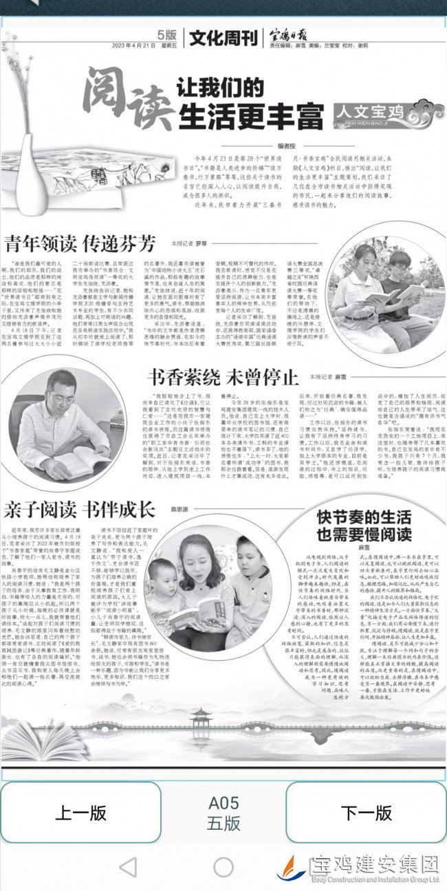 編者按:在第28個(gè)世界讀書(shū)日到來(lái)之際,《寶雞日?qǐng)?bào)》社策劃了讀書(shū)專(zhuān)版,鑒于寶雞建安集團(tuán)工會(huì)長(zhǎng)期堅(jiān)持舉辦的“書(shū)香企業(yè)”征文活動(dòng)在社會(huì)的影響力與美譽(yù)度,記者來(lái)電提出采訪意向,公司工會(huì)極力舉薦了來(lái)自基層一線熱愛(ài)閱讀并多次參與讀書(shū)征文的技術(shù)人員張振東同志。5月21日,《寶雞日?qǐng)?bào)》發(fā)表了這篇小專(zhuān)訪,現(xiàn)予轉(zhuǎn)發(fā)。