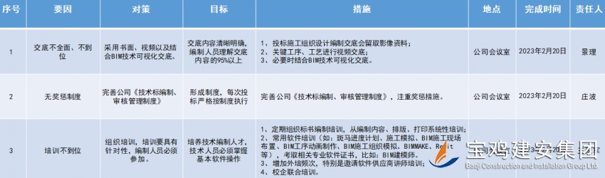 浦賽紅從“5M1E”原因類別入手,即人員、機(jī)器、材料、方法、環(huán)境、測(cè)量,收集各種信息、數(shù)據(jù)資料,對(duì)分析出來的所有末端原因到現(xiàn)場(chǎng)進(jìn)行測(cè)量、試驗(yàn)、調(diào)查分析,找出主要原因,整理分析得出正確結(jié)論,制定滅蚊措施。利用科學(xué)的統(tǒng)計(jì)方法,浦賽紅把這最微不足道的小事,做到了極致,成了“專家”。由此看來,人類從最開始面對(duì)事物到逐步認(rèn)識(shí)世界和改造世界的過程中,統(tǒng)計(jì)方法起到了重大作用。 在科學(xué)技術(shù)高速發(fā)展的今天,統(tǒng)計(jì)方法在潛移默化中得到了日益廣泛和深入的應(yīng)用。技術(shù)管理過程中應(yīng)用科學(xué)的統(tǒng)計(jì)方法排列圖法,提高投標(biāo)施工組織設(shè)計(jì)審核合格率。見下圖:通過整理近年全公司投標(biāo)施工組織設(shè)計(jì)編寫情況,對(duì)投標(biāo)施工組織設(shè)計(jì)審核結(jié)論進(jìn)行分析、統(tǒng)計(jì)、總結(jié)。根據(jù)排列圖分析,影響標(biāo)書審核得分的關(guān)鍵因素是“投標(biāo)施工組織設(shè)計(jì)內(nèi)容針對(duì)性不強(qiáng)”,“項(xiàng)目部、分公司投標(biāo)負(fù)責(zé)人或組織人員缺乏系統(tǒng)性部署”其累計(jì)頻率已達(dá)到77.77%,是主要解決的問題。經(jīng)過討論、分析,按照PDCA原則,最后制定了相應(yīng)實(shí)施對(duì)策與措施,落實(shí)責(zé)任人和完成時(shí)間,對(duì)策表見下圖:學(xué)習(xí)永無止境,在技術(shù)管理方面要不斷掌握和應(yīng)用更多的統(tǒng)計(jì)方法,這樣就有利于更好地解決技術(shù)問題。除此之外,端正工作態(tài)度,提高自身業(yè)務(wù)水平。立足平凡崗位,從點(diǎn)點(diǎn)滴滴日常工作小事做起,腳踏實(shí)地,改變思維,創(chuàng)新工作。從而做到知己知彼,百戰(zhàn)不殆。